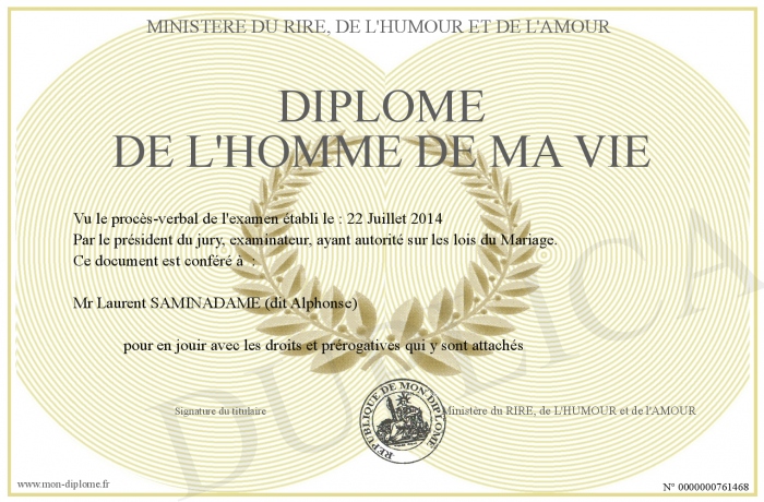 Envoyez par email votre Diplôme de l'HOMME de Ma VIE personalisé