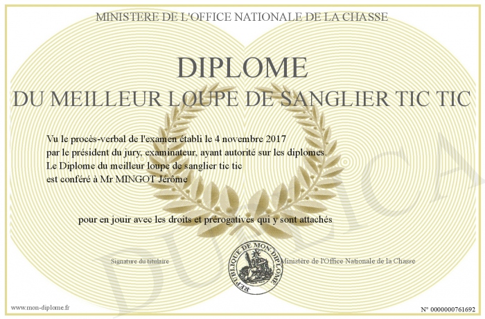 Envoyez par email votre Diplôme du meilleur loupe de sanglier tic tic personalisé