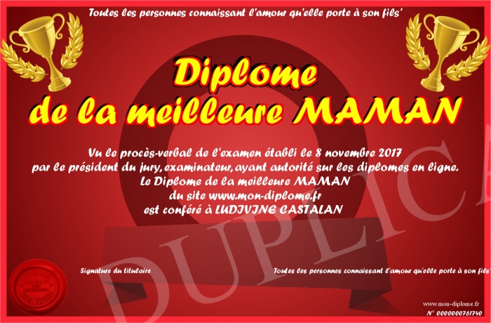 Envoyez par email votre Diplôme de la meilleure MAMAN personalisé