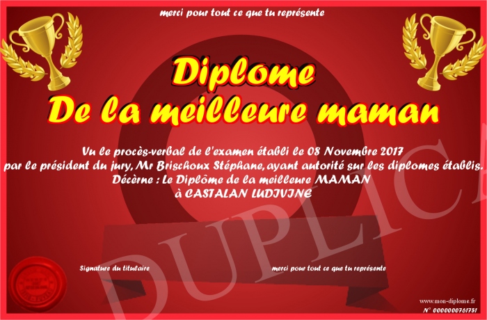 Envoyez par email votre Diplôme De la meilleure maman personalisé