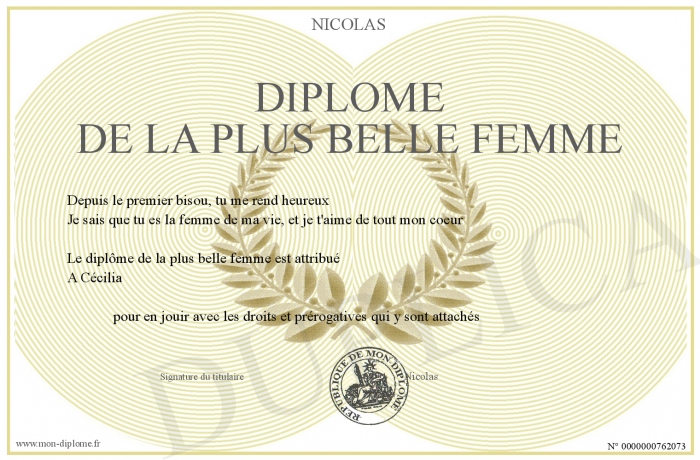 Envoyez par email votre Diplôme de la plus belle femme personalisé