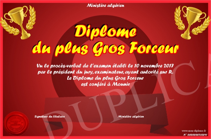 Envoyez par email votre Diplome du plus Gros Forceur personalisé