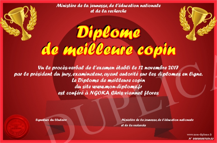 Envoyez par email votre Diplôme de meilleure copin personalisé