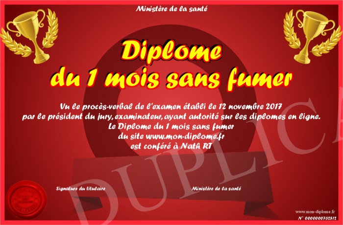 Envoyez par email votre Diplôme du 1 mois sans fumer personalisé