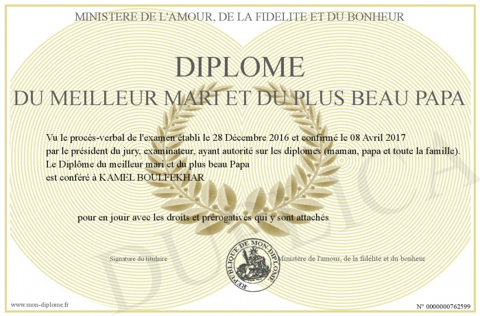 Envoyez par email votre Diplôme du meilleur mari et du plus beau Papa personalisé