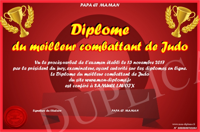 Envoyez par email votre Diplôme du meilleur combattant de Judo personalisé