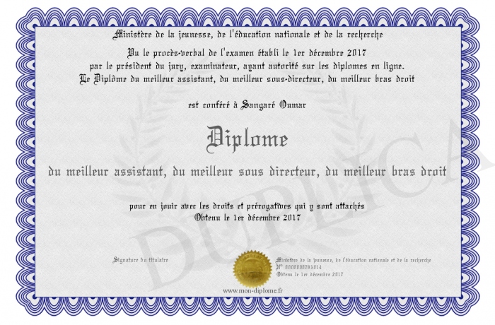 Envoyez par email votre Diplôme du meilleur assistant, du meilleur sous directeur, du meilleur bras droit personalisé