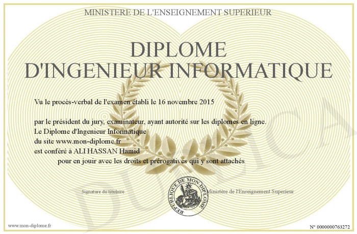 Envoyez par email votre Diplôme d'Ingenieur Informatique personalisé