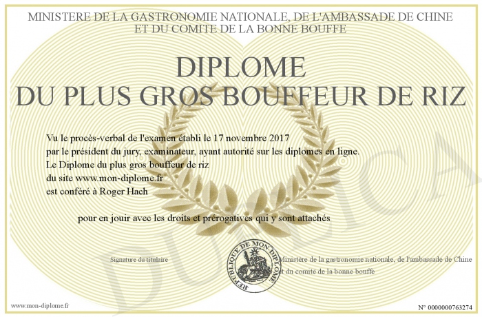 Envoyez par email votre Diplôme du plus gros bouffeur de riz personalisé