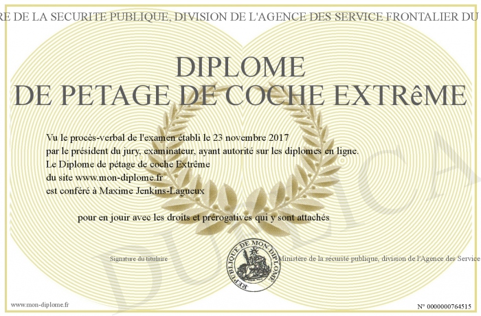 Envoyez par email votre Diplôme de pétage de coche Extrême personalisé