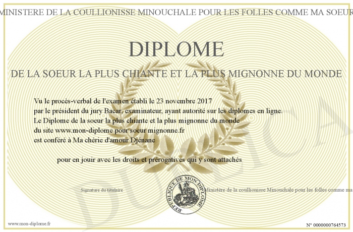 Envoyez par email votre Diplôme de la soeur la plus chiante et la plus mignonne du monde personalisé