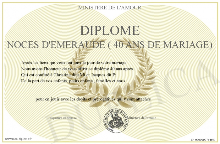 Envoyez par email votre Diplôme Noces d'émeraude ( 40 ans de mariage) personalisé