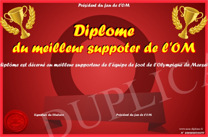 Envoyez par email votre Diplôme du meilleur suppoter de l'OM personalisé