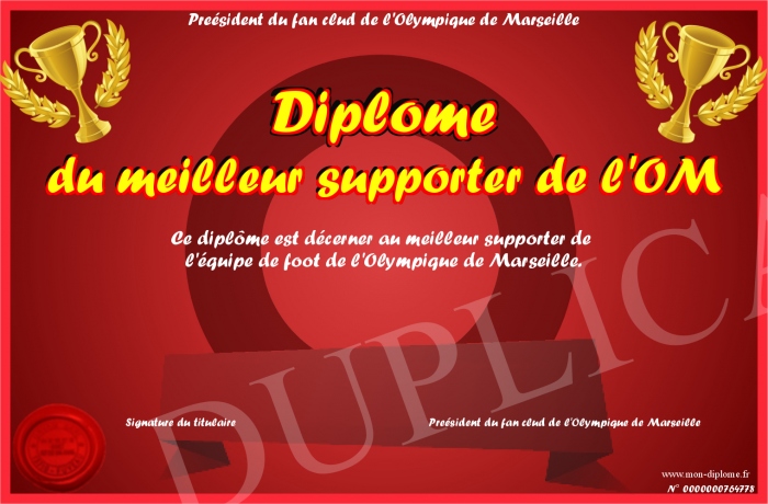 Envoyez par email votre Diplôme du meilleur supporter de l'OM personalisé