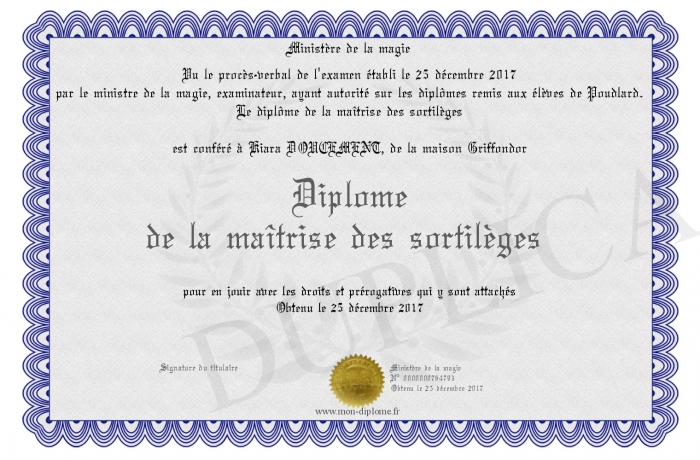 Envoyez par email votre Diplôme de la maîtrise des sortilèges personalisé