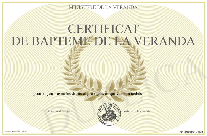 Envoyez par email votre Certificat de bapteme de la véranda personalisé