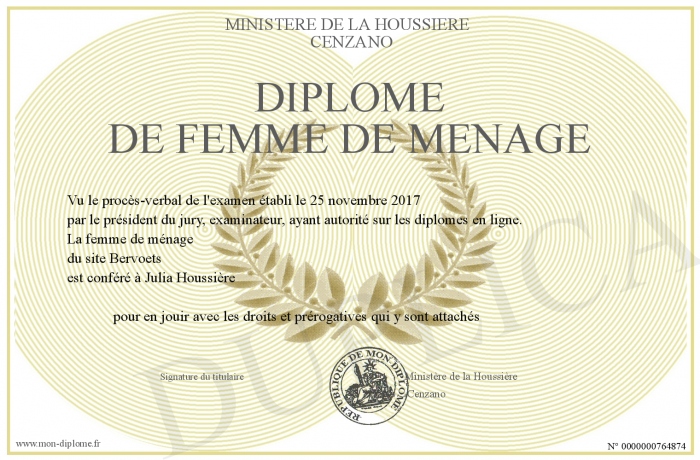 Envoyez par email votre Diplôme de femme de ménage personalisé