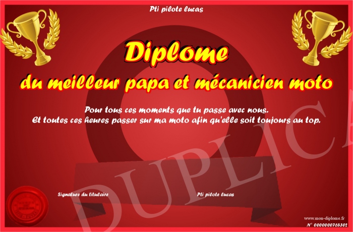 Envoyez par email votre Diplôme du meilleur papa et mécanicien moto personalisé