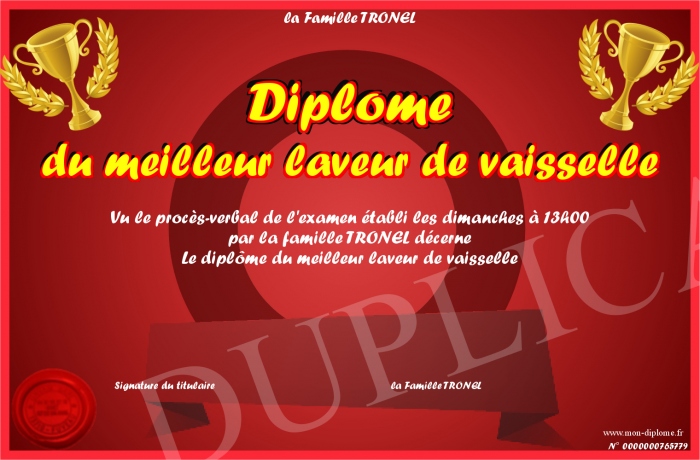 Envoyez par email votre Diplôme du meilleur laveur de vaisselle personalisé