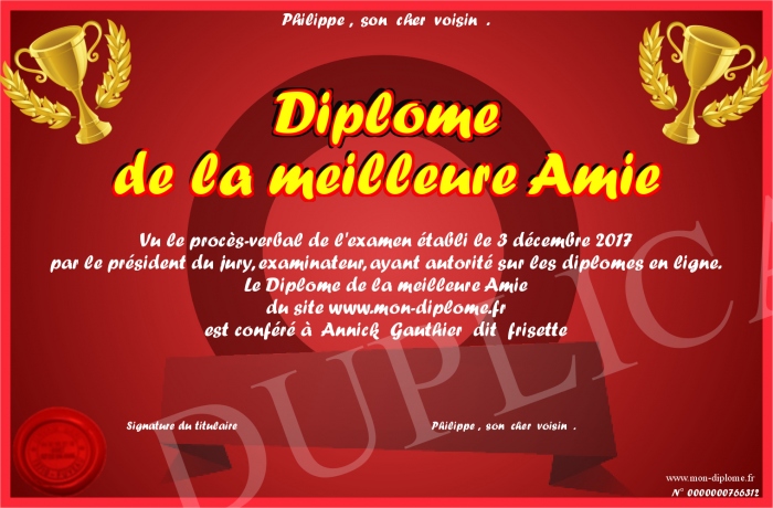 Envoyez par email votre Diplome de la meilleure Amie personalisé