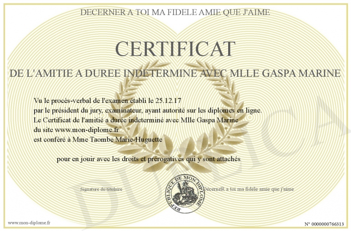 Envoyez par email votre Certificat de l'amitié a durée indeterminé avec Mlle Gaspa Marine personalisé