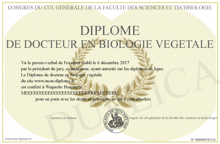 Envoyez par email votre Diplôme de docteur en biologie végétale personalisé