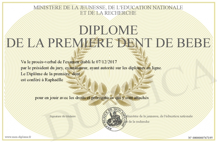 Envoyez par email votre Diplôme de la première dent de bébé personalisé