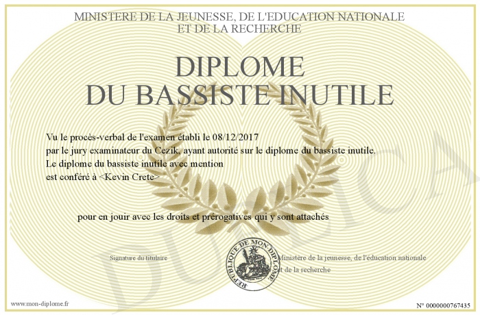 Envoyez par email votre diplome du bassiste inutile personalisé