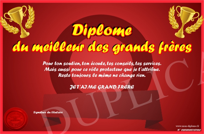 Envoyez par email votre Diplôme du meilleur des grands frères personalisé
