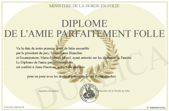 Envoyez par email votre Diplôme de l'amie parfaitement folle personalisé