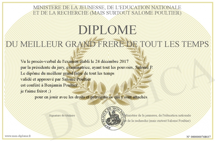 Envoyez par email votre Diplôme du meilleur grand frère de tout les temps personalisé