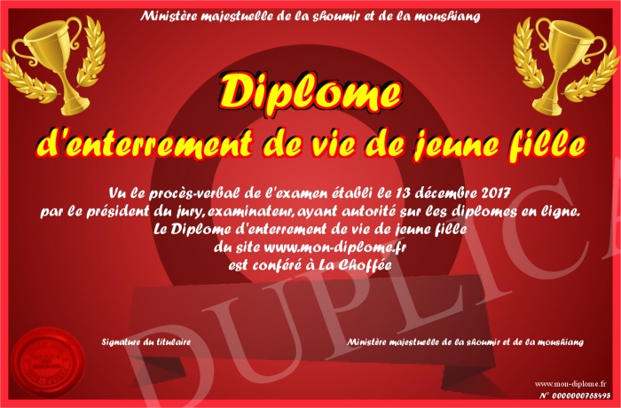 Envoyez par email votre Diplôme d'enterrement de vie de jeune fille personalisé