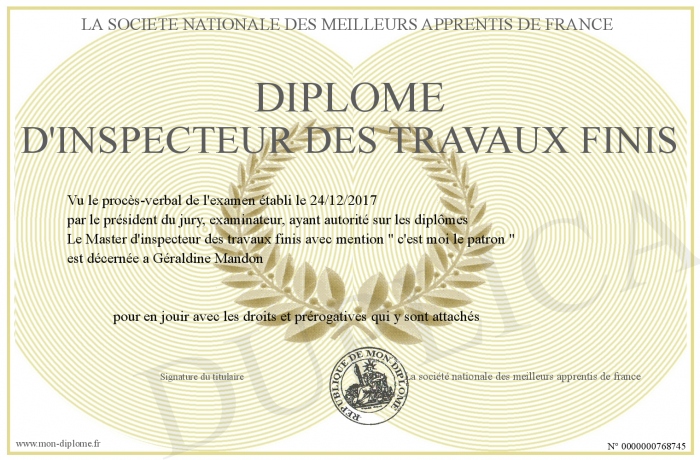 Envoyez par email votre Diplôme d'inspecteur des travaux finis personalisé