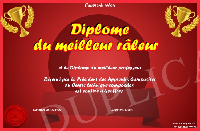 Envoyez par email votre Diplôme du meilleur râleur personalisé