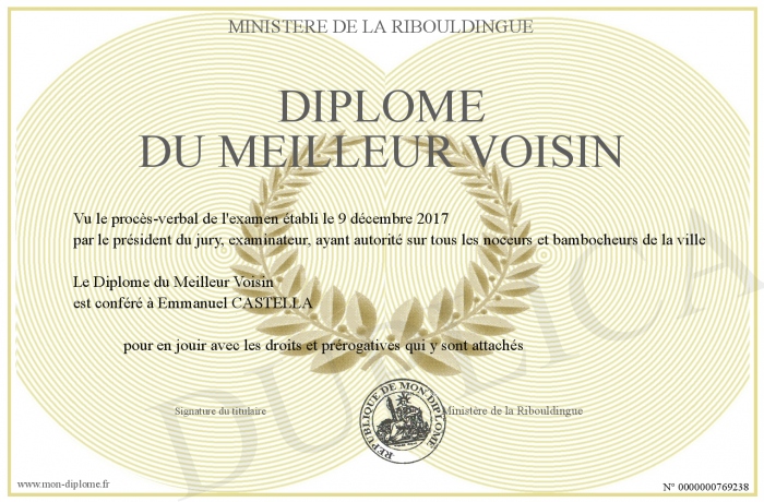 Envoyez par email votre Diplôme du Meilleur Voisin personalisé