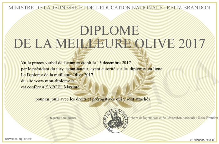 Envoyez par email votre Diplôme de la meilleure Olive 2017 personalisé