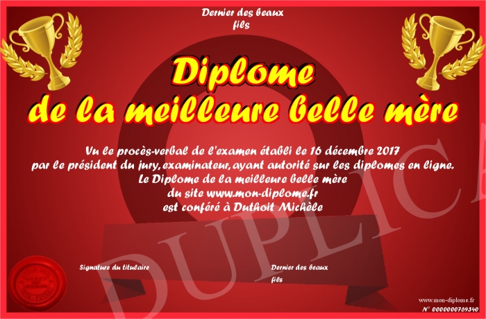 Envoyez par email votre Diplôme de la meilleure belle mère personalisé