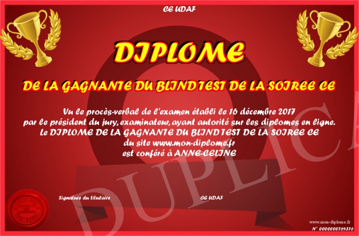 Envoyez par email votre DIPLOME DE LA GAGNANTE DU BLIND TEST DE LA SOIREE CE personalisé