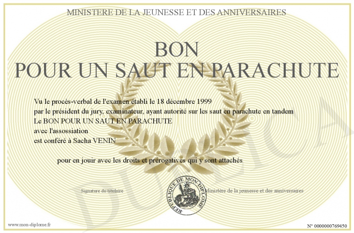 Envoyez par email votre BON POUR UN SAUT EN PARACHUTE personalisé
