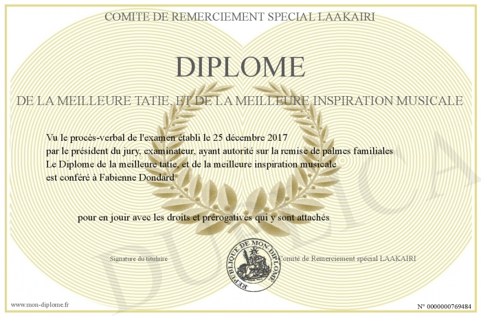 Envoyez par email votre Diplôme de la meilleure tatie, et de la meilleure inspiration musicale personalisé