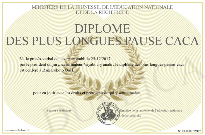 Envoyez par email votre Diplôme des plus longues Pause caca personalisé