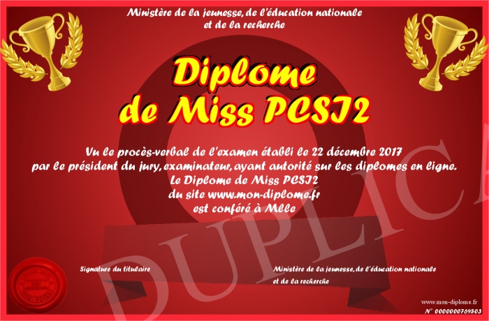 Envoyez par email votre Diplôme de Miss PCSI2 personalisé