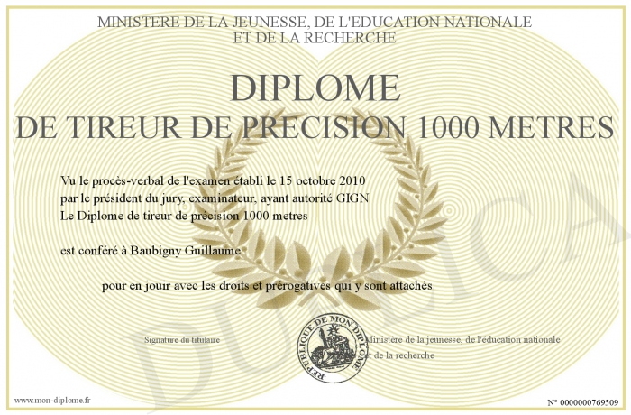 Envoyez par email votre Diplôme de tireur de précision 1000 metres personalisé