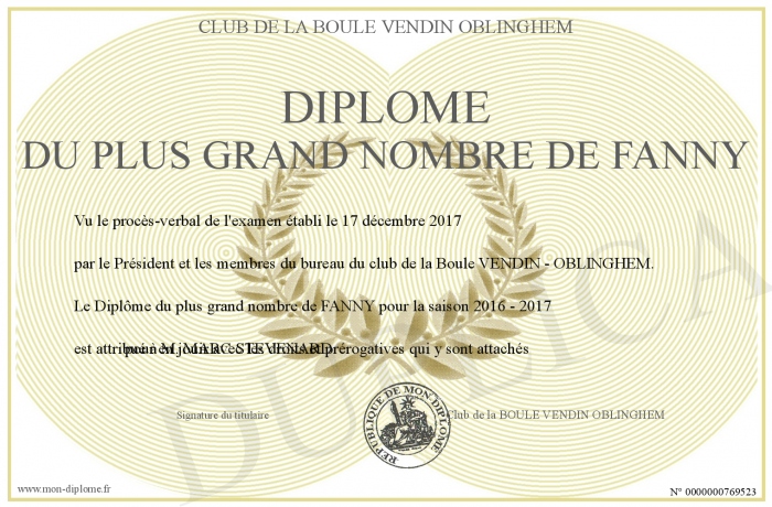 Envoyez par email votre Diplôme du plus grand nombre de FANNY personalisé