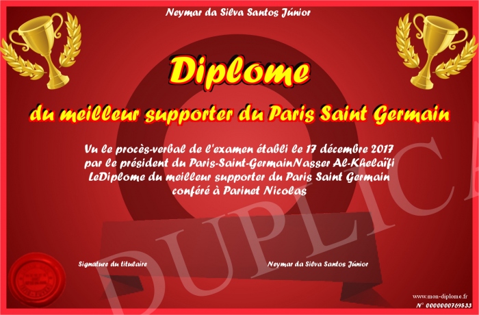 Envoyez par email votre Diplôme du meilleur supporter du Paris Saint Germain personalisé