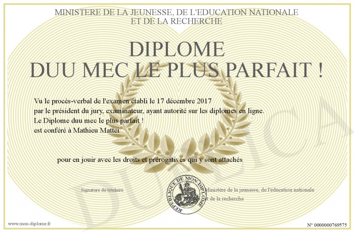 Envoyez par email votre Diplome duu mec le plus parfait ! personalisé