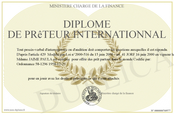 Envoyez par email votre Diplôme de prêteur internationnal personalisé