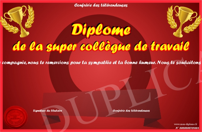 Envoyez par email votre Diplôme de la super collègue de travail personalisé
