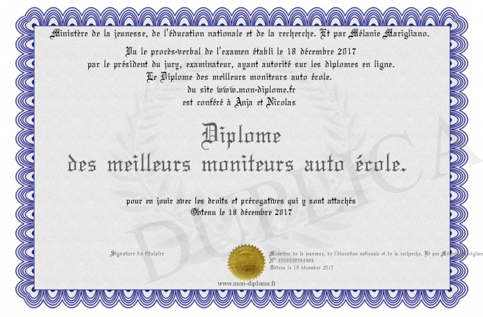 Envoyez par email votre Diplôme des meilleurs moniteurs auto école. personalisé