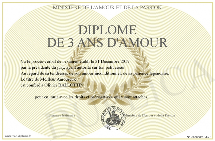 Envoyez par email votre Diplôme de 3 ans d'amour personalisé
